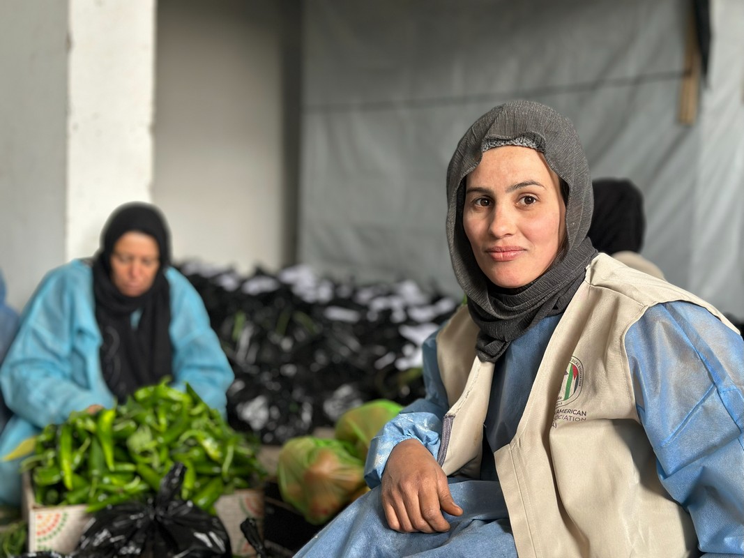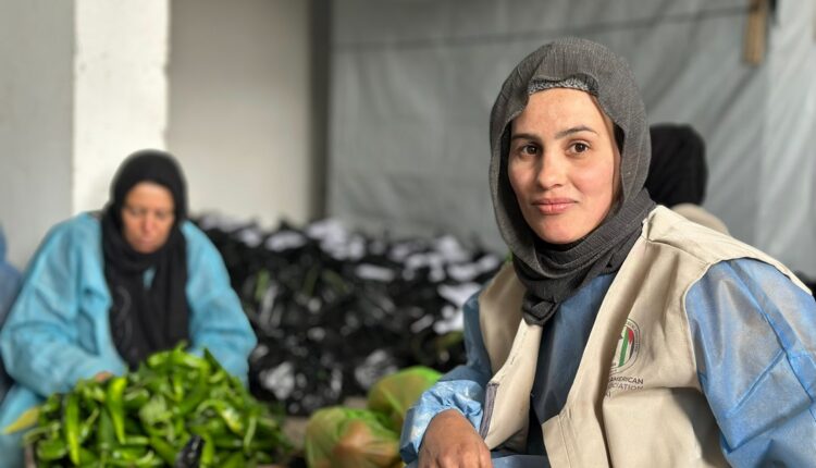 بين مجموعة من النساء في مدينة بيت لاهياً شمال قطاع غزة، تعمل فداء على تجهيز سلال الخضار للنازحين الفلسطينيين والتضررين من حرب الإبادة الجماعية التي شنتها قوت الاحتلال على قطاع غزة، منذ السابع من أكتوبر 2023.